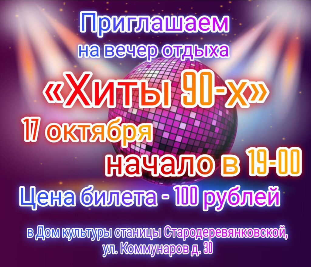 17 октября состоится вечер отдыха «Хиты 90-х» в 19-00.