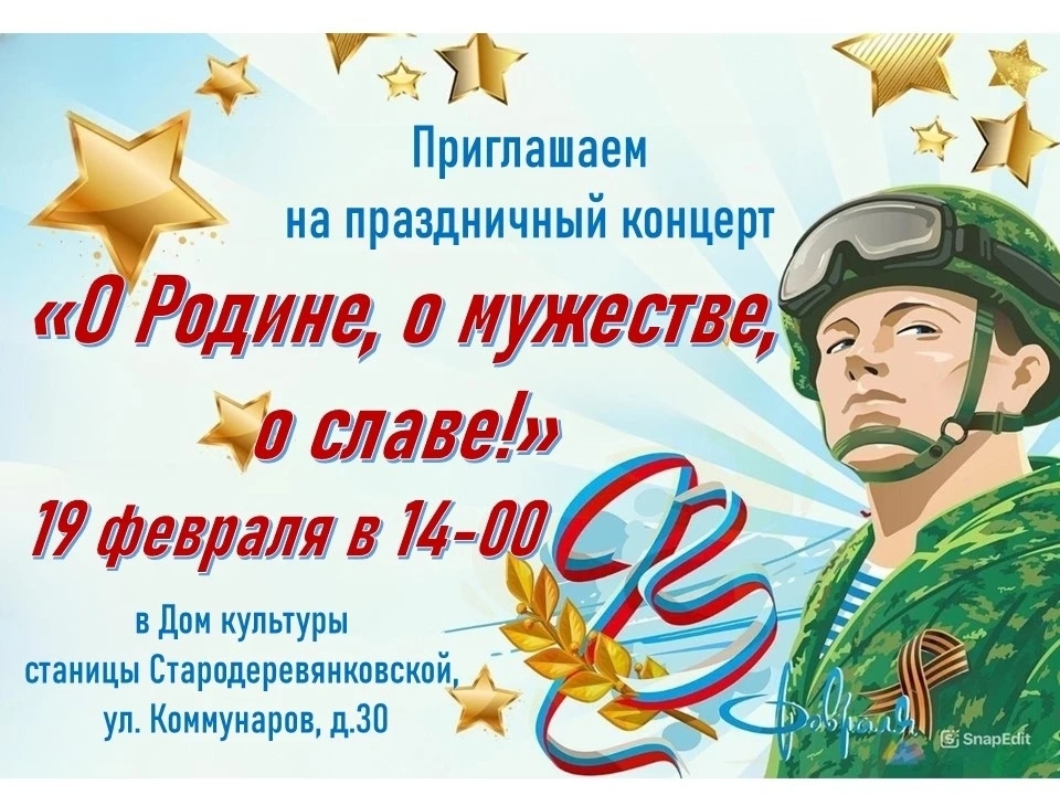 19 февраля 2026 года в 14:00 ч. в СДК ст. Стародеревянковская, ул. Коммунаров 30, состоится праздничный концерт ко Дню защитника Отечества! Мы рады пригласить Вас на концерт, уверены, что Вы проведете время с пользой.
