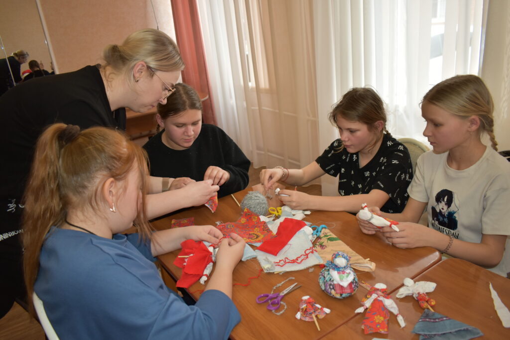 Руководитель кружка, Ольга Путинцева, рассказала ребятам о том, что тряпичная кукла была традиционной игрушкой в быту русской деревни и несла в себе особый символический смысл.