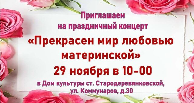Уважаемые жители и гости станицы Стародеревянковской! Есть отличный повод собраться вместе! 29 ноября в 10:00 приглашаем вас на праздничный концерт, посвященный Дню Матери. Приходите насладиться приятной атмосферой и творческими номерами. Будем рады видеть каждого!